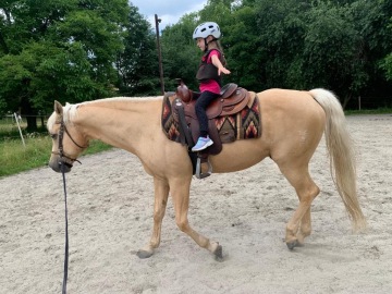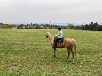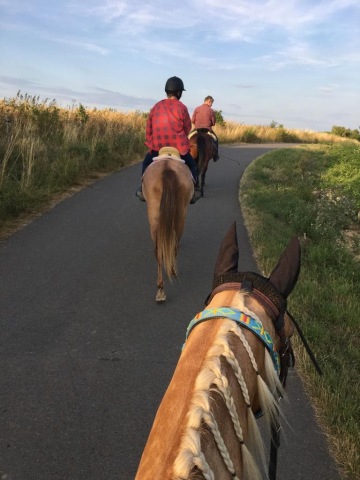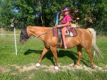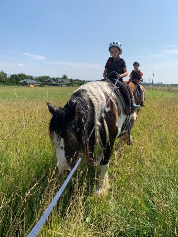 Na našich pastvinách o rozloze 4 ha jsme vytýčili stezku, kde si zájemci mohli v bezpečném prostředí vyzkoušet jízdu na koni v kroku, v klusu i ve cvalu a v otevřené krajině se mohli připravit na aktivitu 4 - Poodřím na koni. Začátečníci a malé děti absolvovali projížďku pastvinami v kroku s vodičem. -