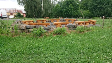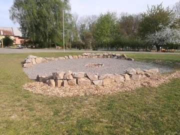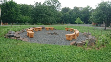 Přírodní zahrada, která je prioritně určena k rozvíjení a prohlubování zájmu dětí o zvířata, rostliny a různé živočichy, má také snahu vytvořit příjemné prostředí a navodit pocit určité pospolitosti. Prostředkem k podpoře komunitního setkávání bylo vybráno ohniště. Oheň vytváří příjemnou atmosféru a je zdrojem pohodového tepla. Důvodem je také skutečnost, že posezení u otevřeného ohně je pro dnešní děti žijící v bytových domech vzácností. Pod vedením lektorů si děti mohou samy rozdělat oheň, což přispívá k rozvoji samostatnosti, kreativity a odpovědnosti za své bezpečné chování při poměrně nebezpečné aktivitě. K posezení bylo v projektu navrženo pořízení 8 ks laviček z polokulatiny. Výsadbu u ohniště tvoří 5 ks listnatých keřů a 20 ks travin (vše zamulčováno drobným drceným kamenem).