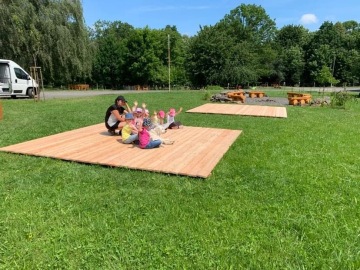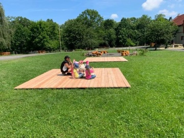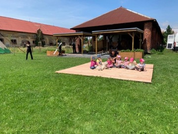 Slouží pro pozorování přírody v zahradě. Podium je složeno ze tří částí s plochou 7 x 3,5 m. Kterákoliv část může být umístěna samostatně pro menší skupinky dětí nebo položena vedle sebe pro pozorování a povídání větší skupiny dětí. Při těchto aktivitách byly z projektu pořízeny a využity stoly a lavice (stůl 2 ks a lavice 8 ks). Variabilita tohoto podia a dřevěný lehce přenositelný nábytek umožní využívat k poznání a hrám celou zahradu. V případě jejich nevyužití (realizaci jiných aktivit v přírodní zahradě) či nepřízni počasí budou uloženy v dřevěném přístřešku (jednoduchá dřevěná konstrukce ukotvena na betonových patkách) - bez pevné podlahy (pouze drenážní štěrková vrstva). Projekt má za cíl pozorovat přírodu ve všech ročních obdobích a rovněž i za nepříznivého počasí, k čemuž přístřešek slouží zejména. Vedle přístřešku jsou umístěny vyvýšené dřevěné záhony (5 ks). Na těchto záhonech se rovněž vysadily trvalky (jahodník – 40 ks). Rostliny v záhonech slouží rovněž k poznávání rostlin a jejich vnímání všemi smysly v průběhu měnících se podmínek ročních období.