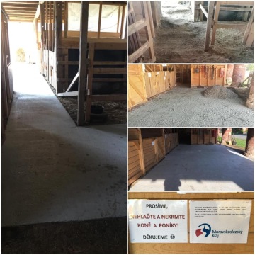 Některá zvířata jsou ustájena ve venkovní dřevěné stáji, kde dřív byla stará hliněná podlaha, která se drolila a byly v ní velké nerovnosti a nebezpečné díry. Z projektu jsme vyhotovili novou podlahu, aby bylo ustájení zvířat pohodlně přístupné i pro imobilní návštěvníky a rodiče s kočárky. Navíc díky světlé barvě podlahy je ve stáji více světla.